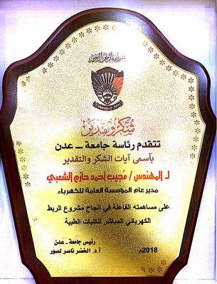 جامعة عدن تمنح درع تكريمي لمدير الكهرباء الشعبي منحت جامعة عدن درعا تكريميا لمدير عام مؤسسة كهرباء عدن مجيب الشعبي. وجاء منح الجامعة ممثلة بر...