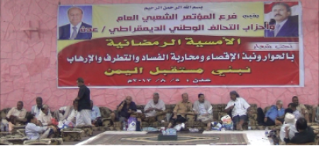حزب المؤتمر يحشد انصاره في امسية رمضانية بعدن اقام اعضاء المؤتمر الشعبي العام وأحزاب التحالف الوطني بمحافظة عدن، أمس أمسية رمضانية حضرها قيادات ال...
