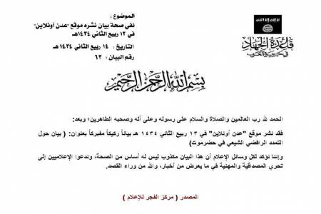 القاعدة تنفي علاقتها ببيان نشره " عدن اونلاين" التابع لحزب الاصلاح نفى تنظيم القاعدة في جزيرة العرب علاقتة في البيان الذي نشرته وسائل اعلام تابعة لحزب الاصلاح والممولة...