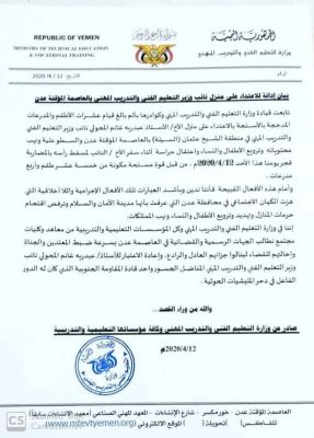 وزارة التعليم الفني تدين الاعتداء على منزل المحولي وتطالب بسرعة ضبط الجناة دانت وزارة التعليم الفني والتدريب المهني الاعتداء المسلح الذي تعرض له منزل عبدربه غا...