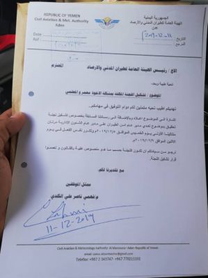 موظفو هيئة الطيران ينددون بإجراء تعسفي لنقل احد ممثليهم ندد موظفو هئية الطيران المدني والأرصاد الموقعين أدناه، بالقرار المجحف الصادر من رئيس ا...