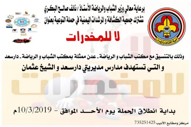 عدن: تدشين حملة" لا للمخدرات" بمشاركة الكشافة غدا تدشن في العاصمة عدن، يوم غد الاحد، حملة للتوعية بمخاطر المخدرات في المدارس، والتي ترعاها وزارة الشبا...