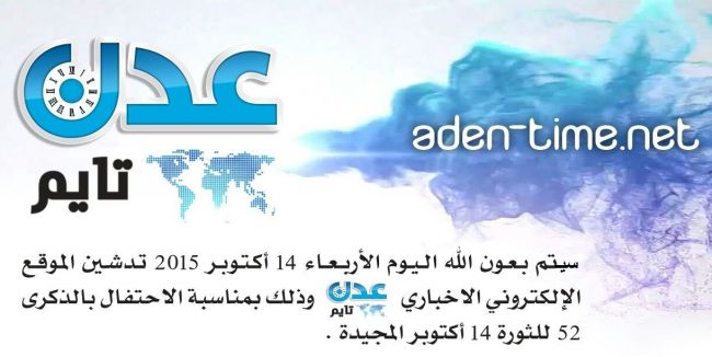 ”عدن تايم" اضافة جديدة للصحافة الالكترونية سيتم بعون الله غدا الأربعاء 14 أكتوبر 2015 تدشين الموقع الإلكتروني الاخباري " عدن تايم "وذلك ب...