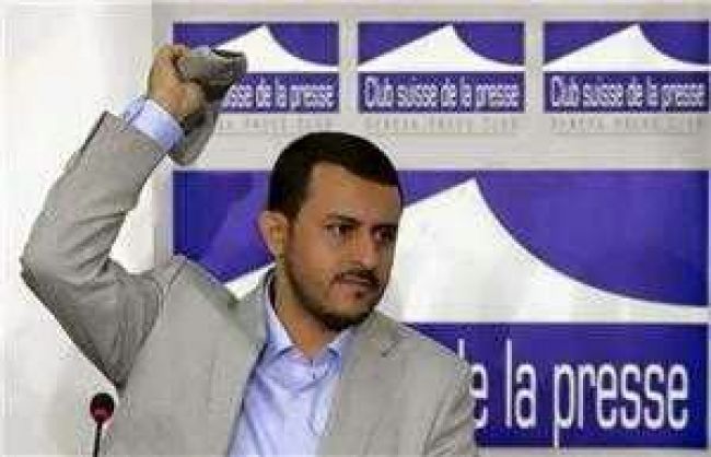 امرأة عدنية ترشق حمزة الحوثي بحذاء في جنيف أثناء كلامه قطع أنصار الحكومة اليمنية مؤتمرا صحافيا عقده مسؤولون في جماعة الحوثي المدعومة من إيران في جنيف، يوم...