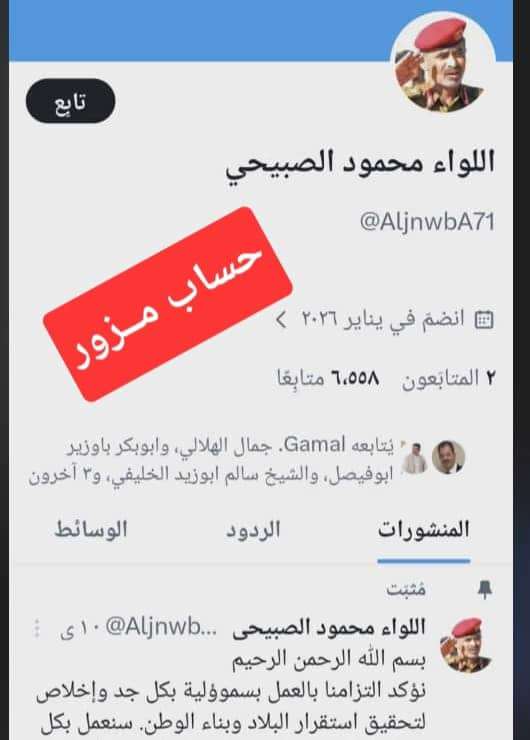 وطالب الفريق الصبيحي من جميع رواد مواقع التواصل الإجتماعي عدم التعامل مع أي حساب يحمل أسمة على "توتير وفيسبوك"، متمنياً من الجميع الإبلاغ عن هذه الصفحات الزائفه.