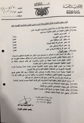 شكل رئيس الوزراء الدكتور أحمد عبيد بن دغر اليوم الاثنين لجنة لشراء مادتي الديزل والمازوت لكهرباء عدن برئاسة نائب وزير المالية وعضوية كلا من نائب وزير الكهرباء و وكيل أول محافظة عدن و مدير عام شركة النفط و مدير شركة المصافي و مدير فرع البنك المركزي عدن.