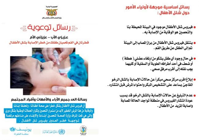 تتواصل الاستعدادات في 333 مديرية في 23 محافظة يمنية لتنفيذ حملة للتحصين ضد شلل الاطفال في الفتره من 28-26 من الشهر الجاري، بدعم من وزارة الصحة ومنظمة اليونيسيف والصحة العالمية.