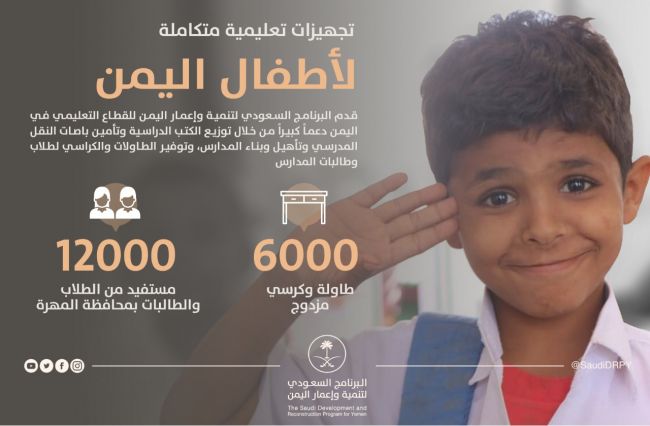 قدّم البرنامج السعودي لتنمية وإعمار اليمن دعم جديد للقطاع التعليمي في اليمن، تمثّل في توزيع 6000 طاولة ومقعد دراسي مزدوج يستفيد منها 12000 طالب وطالبة في مدارس المهرة.