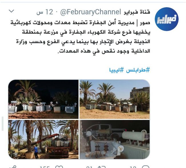 ونفت المؤسسة في بلاغ صحفي صحة المزاعم المتداولة في بعض مواقع التواصل الاجتماعي بشأن ضبط عدد كبير من المحولات التابعة لمؤسسة كهرباء عدن في مزرعة بجعولة، مؤكدة ان الخبر لا أساس له من الصحة، وان الصور المرفقة بالخبر ماخوذة من محرك جوجل لمنطقة الجفارة في ليبيا.