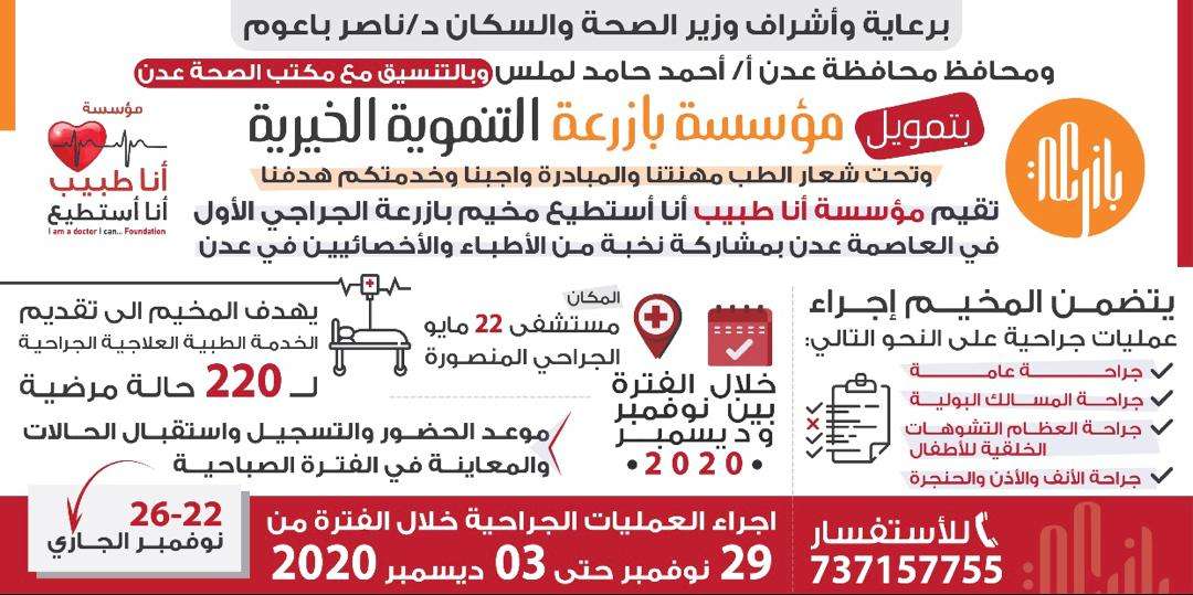 وحدد المؤسسة ان موعد اجراء العمليات خلال الفترة من 29 نوفمبر حتى 3ديسمبر 2020 ، ويهدف مخيم بازرعة الجراحي الأول اجراء العمليات الجراحية ل220 حالة .
