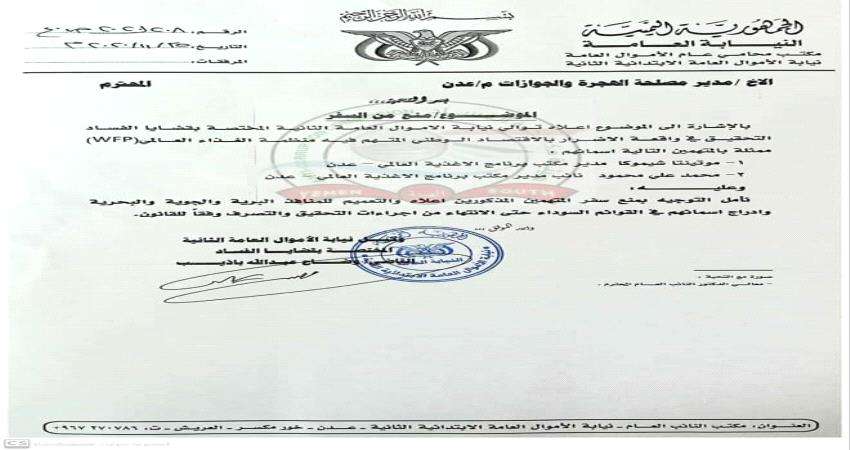 وجهت نيابة الأموال العامة الثانية المختصة بقضايا الفساد، إدارة الهجرة والجوازات في عدن، بمنع سفر موظفي الغذاء العالمي WFP، وذلك على خلفية ضبط مواد غذائية منتهية الصلاحية في مخازنها بعدن.