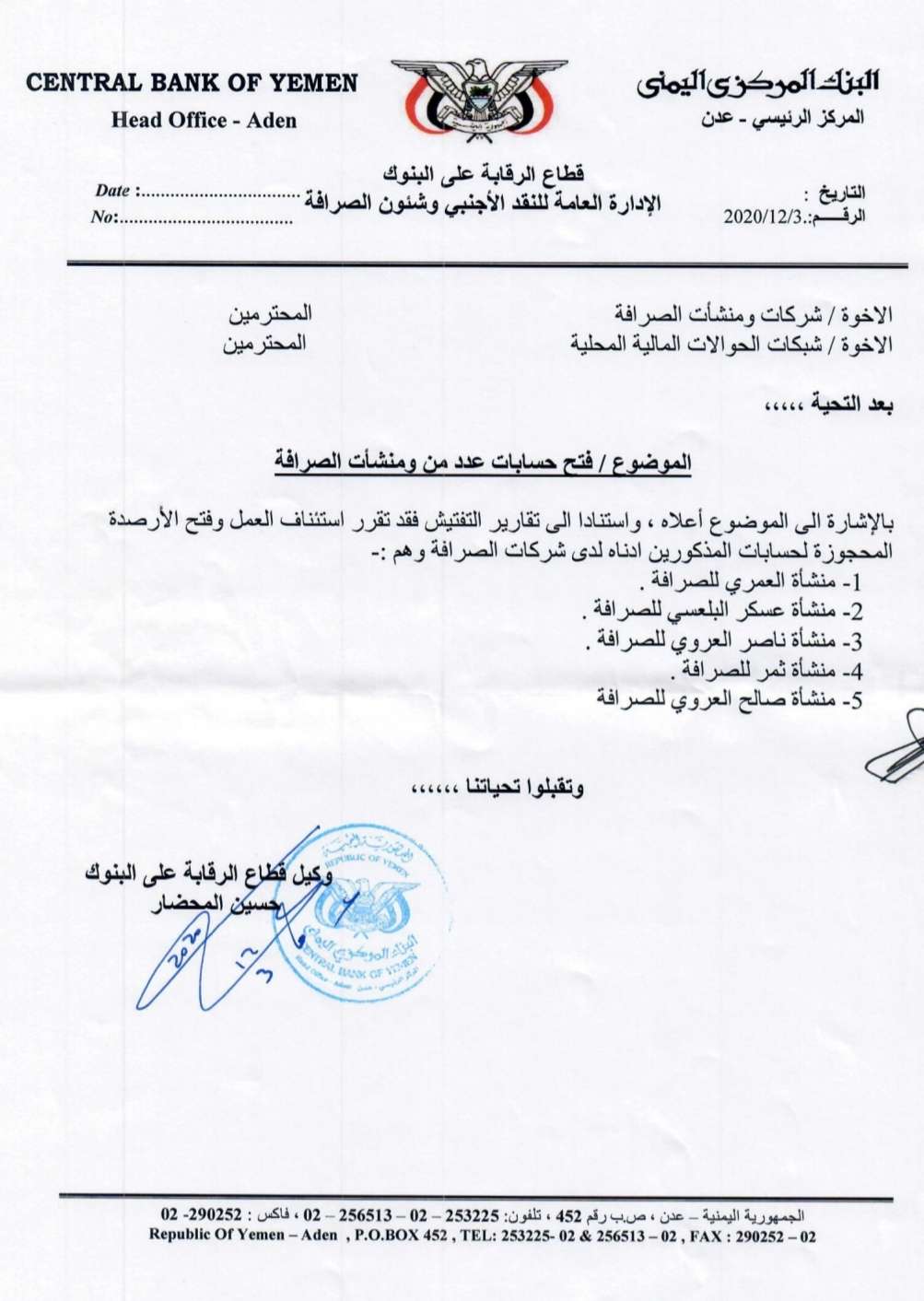اصدر البنك المركزي اليمني اليوم تعميما بفتح حسابات العروي وعددا من شركات الصرافة.