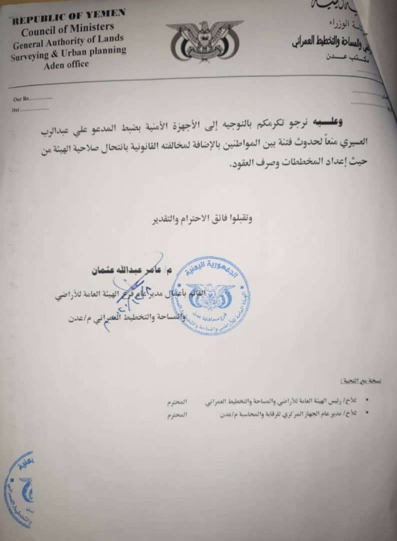 ويأتي توجيه المحافظ الذي حصلت عدن تايم على نسخة منه، تعليقا على مذكرة هيئة الاراضي بضبط المذكور لانتحاله صلاحية هيئة أراضي الدولة من حيث اعداد المخططات وصرف العقود ومنعا لحدوث فتنة بين المواطنين، الذين دفع بهم العسيري للنزول إلى مخططات اراضي بئر فصل المصروفة منذ عام ٩٠م.