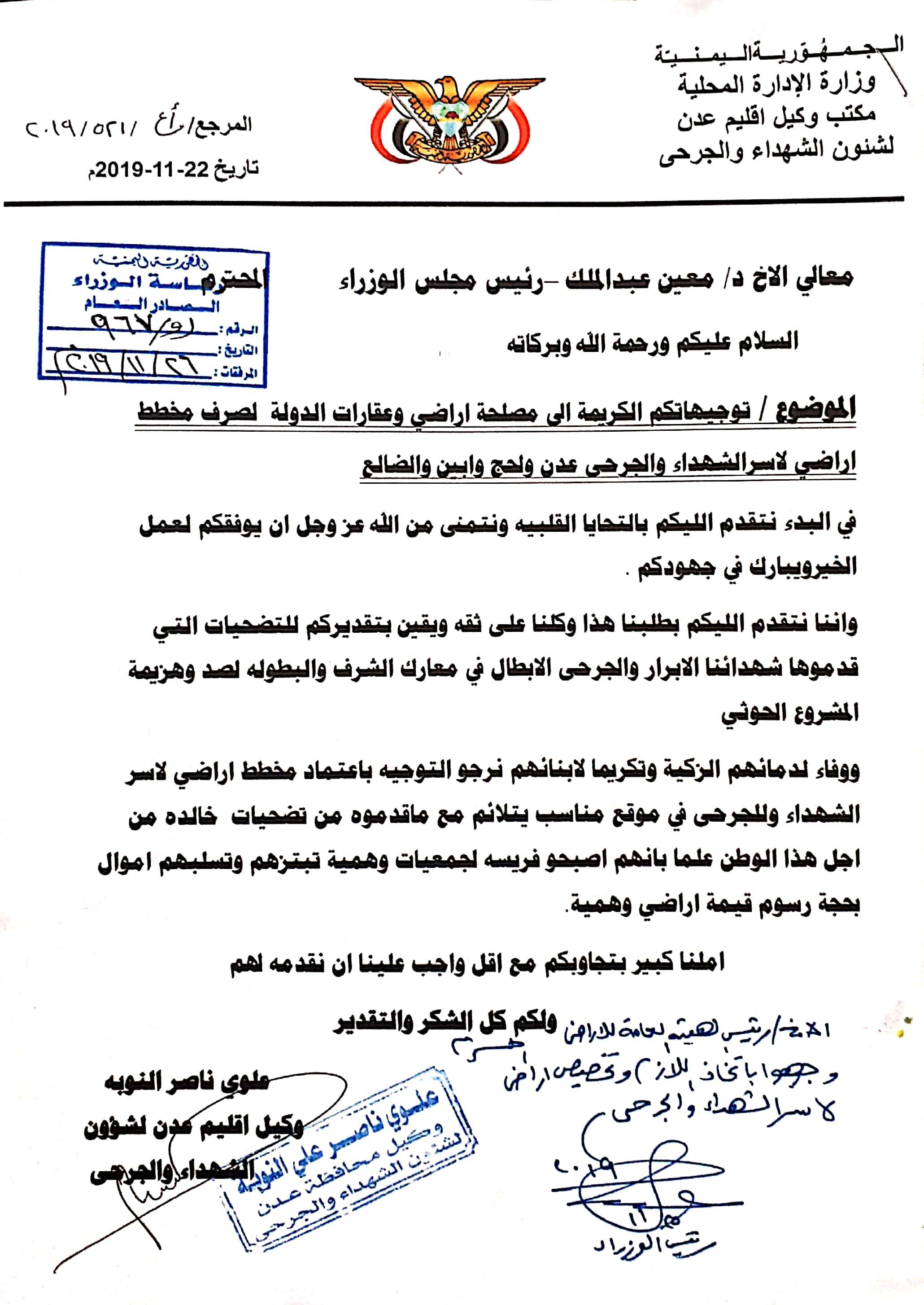 وحذّر المحافظ لملس أسر الشهداء والجرحى من الانجرار خلف الدعوات المشبوهة والابتعاد عن السماسرة وأعمال التحايل والتزوير التي تسلكها بعض الجمعيات المشبوهة، كون الدولة هي الجهة الوحيدة المخوّلة بصرف تلك الأراضي لهم .