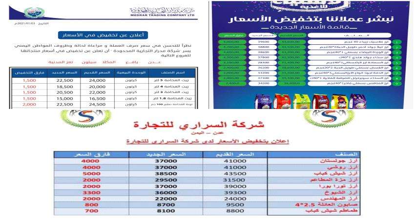 تواصل شركات إستيراد إشهار التخفيضات في المواد الاساسية للبيع بالجملة والتجزئة في عدن.
