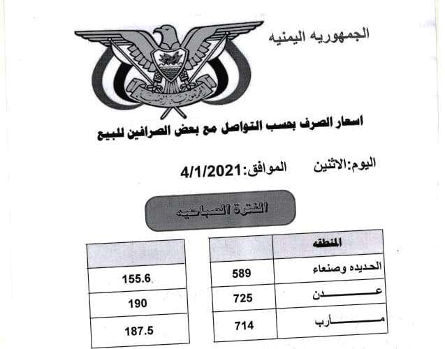 أرتفاع ضئيل بأسعار صرف العملات اليوم بتاريخ 2021-01-04 الساعة 14:14 عدن الدولار: شراء: 705 بيع: 715 السعودي: شراء: 187 بيع: 190 صنعاء الدولار: شراء: 590 بيع: 593 السعودي: شراء: 156 بيع: 156.5 ملاحظة: الأسعار ليست مستقرة