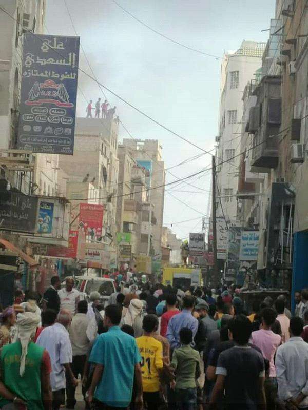 نشب حريق هائل بعمارة سكنية مكونة من ٣ طوابق في سوق الكدر بمدينة كريتر في عدن.