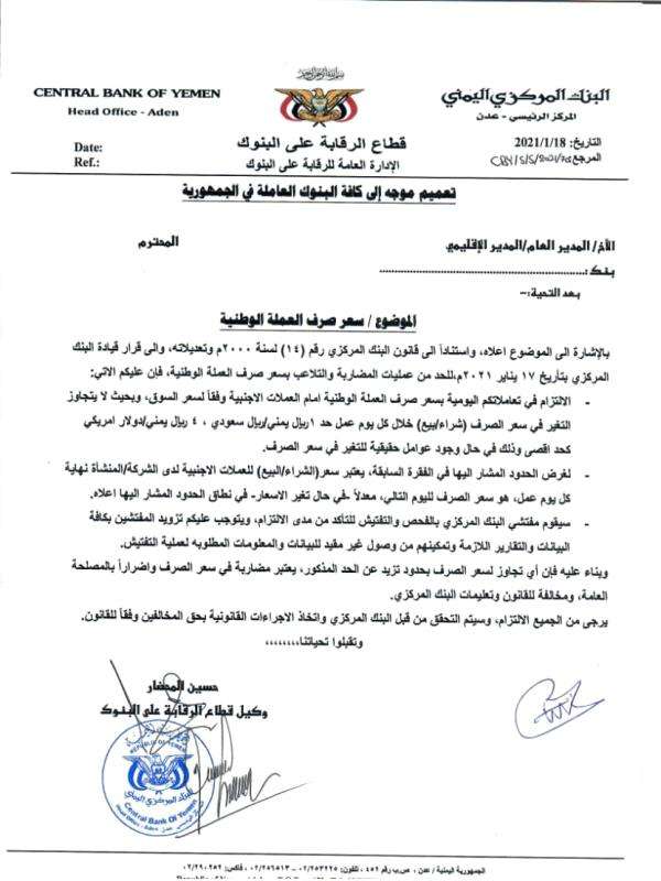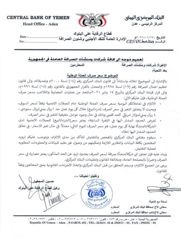 أصدر البنك المركزي من مقره الرئيس بمحافظة عدن، اليوم الإثنين الموافق 2020/1/18م، تعميمين موجهين إلى كافة البنوك التجارية والإسلامية، وكافة شركات ومنشآت الصرافة العاملة في الجمهورية اليمنية، وذلك للحد من عمليات المضاربة والتلاعب بسعر صرف العملة الوطنية.