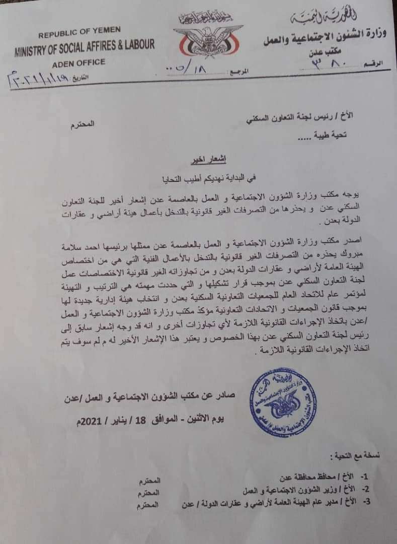 وجه مكتب وزارة الشؤون الاجتماعية والعمل بالعاصمة عدن مذكرة تحت عنوان "إشعار أخير" موجهة للجنة التعاون السكني - عدن يحذرها من التصرفات غير القانونية بتدخلاتها بأعمال هيئة أراضي وعقارات الدولة بعدن.