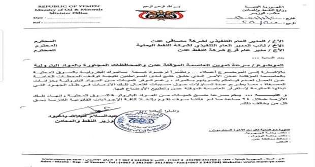 وجه وزير النفط والمعادن عبدالسلام عبدالله باعبود كل من المدير التنفيذي لشركة مصافي عدن ونائب المدير التنفيذي لشركة النفط اليمنية والمدير العام لشركة النفط بمحافظة عدن بتموين السوق المحلي في العاصمة عدن والمحافظات المجاورة بالمشتقات البترولية وبصورة عاجلة في فترة لا تتجاوز 24 ساعة.