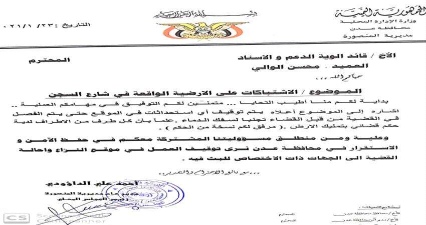 وأكد مدير عام المنصورة ، أحمد الداؤودي ، في رسالته : أنه ومن منطلق المسؤولية المشتركة في حفظ الأمن والإستقرار في محافظة عدن ، يتم توقيف أي عمل في موقع النزاع وإحالة القضية إلى الجهات ذات الأختصاص للبث فيها.