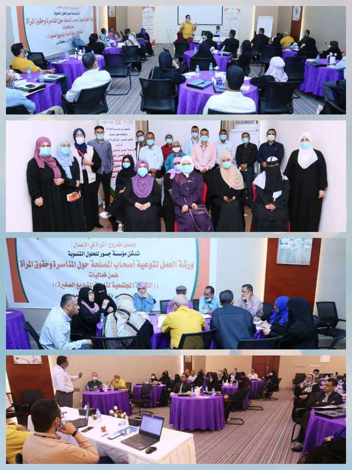شاركت الهيئة اليمنية للمواصفات والمقاييس وضبط الجودة، بورشتي عمل نظمتها مؤسسة جسور للحلول التنموية، برعاية محافظ محافظة عدن/أحمد حامد لملس، تحت عنوان (أصحاب المصلحة حول المناصرة وحقوق المرأة)، وشارك في الورشة جهات حكومية عدة، الخدمة المدنية ومصلحة الضرائب والتأمينات والشؤون القانونية والتعليم الفني والمهني، كما كان ضمن الحضور مجموعة من سيدات الأعمال، وممثلين عن منظمات المجتمع المدني.
