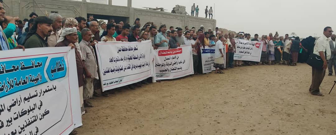وطالب المحتشدون من أجهزة الدولة العليا ذات الاختصاص ومنظمات المجتمع المدني الوقوف مهم ضد عبث النافذين, وانهاء الاعتداءات المتكررة على الاراضي والممتلكات في بلوكات بئر فضل الأربعة, من قبل تجار ومتنفذين تحت اسامي شركات وهمية تدعي الاستثمار, تهدف للسيطرة والبسط على المساحات المخصصة للخدمات والشوارع.