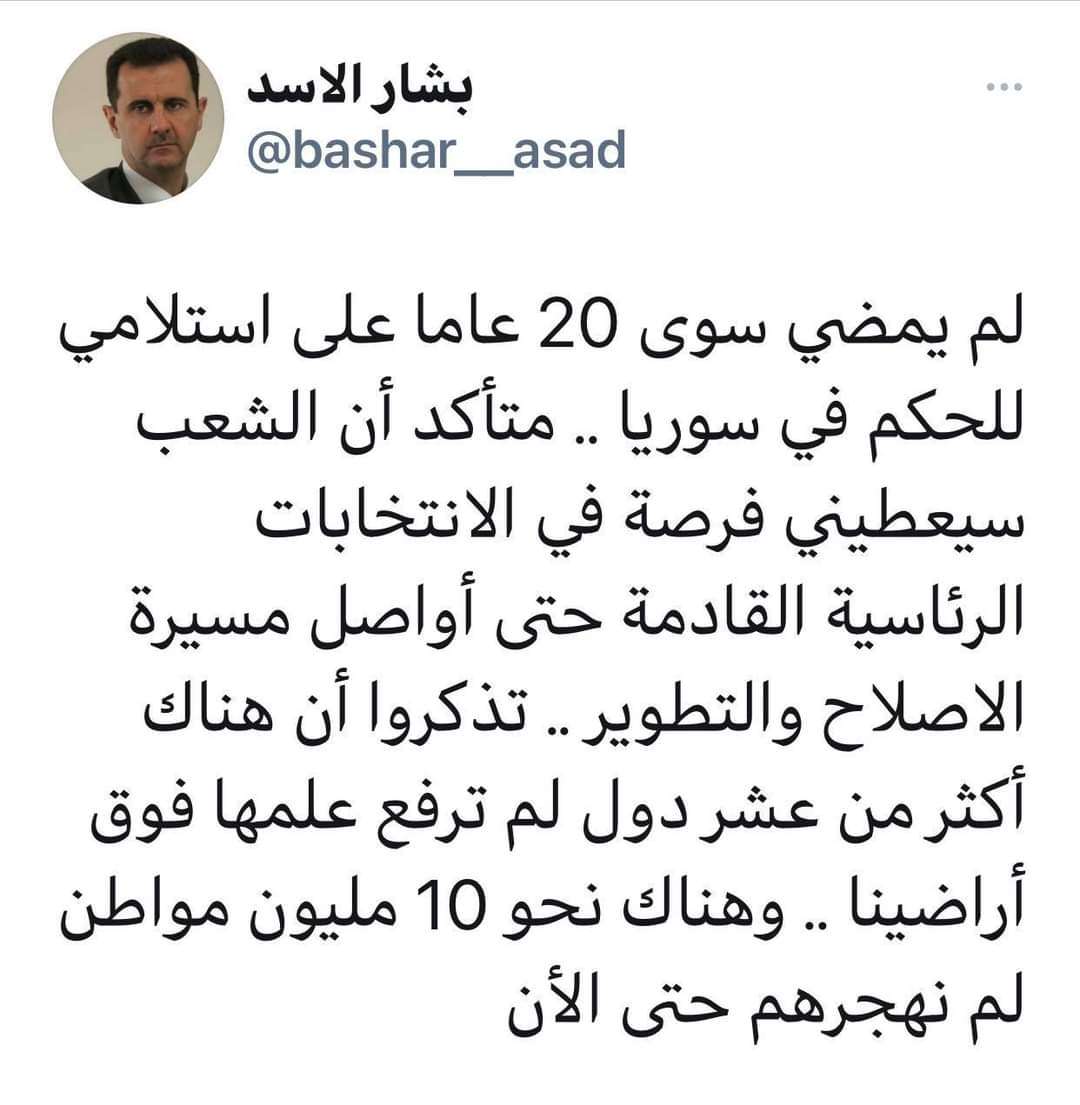 بشار الأسد يخاطب الشعب السوري برسالة قبيل الأنتخابات بتاريخ 2021-02-13 الساعة 19:08 نشر الاعلامي فيصل القاسم ساخرا تغريدة بصفحته الشخصية لبشار الأسد يخاطب الشعب السوري عشية الانتخابات .
