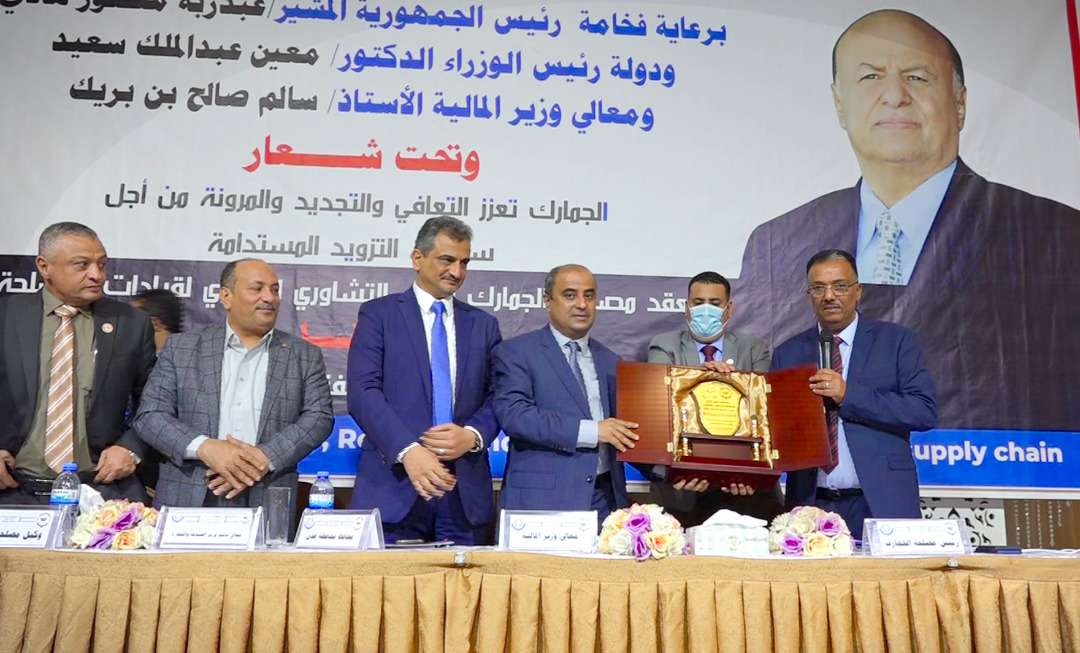 وتخلل الحفل الختامي للقاء التشاوري تقديم درع الجمارك لوزير المالية سالم بن بريك وتكريم موظفي الجمارك المبرزين والجهات المتعاملة مع الجمارك وشخصيات بارزة في مقدمتهم الفنان محمد محسن عطروش.
