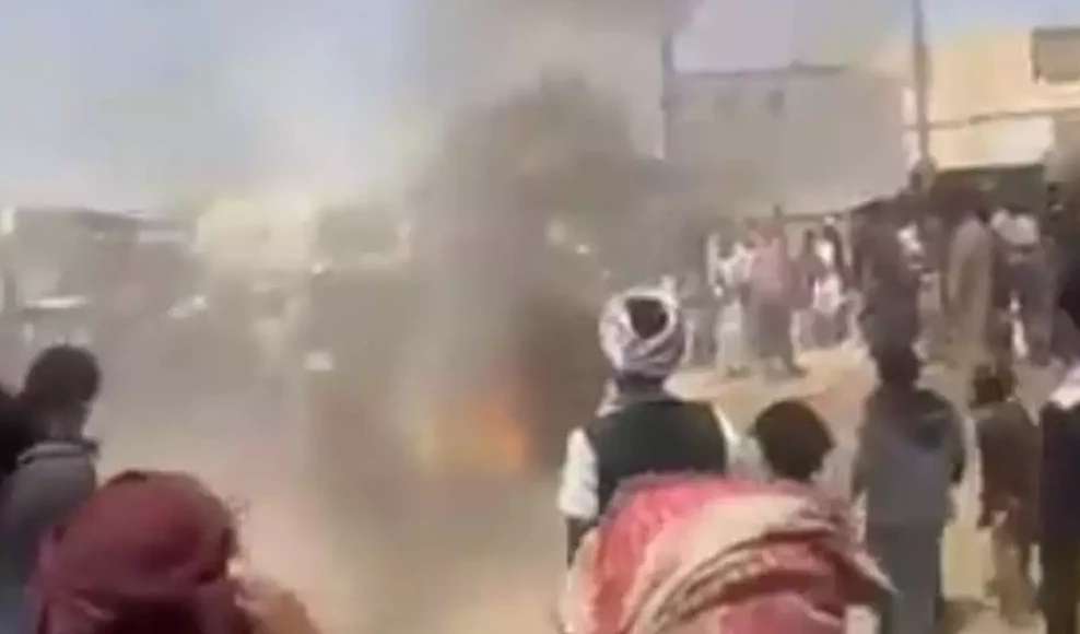 ويظهر في الصورة احتراق الطقم بعد انفجار العبوة الناسفة التي ادت الى سقوط جريح.