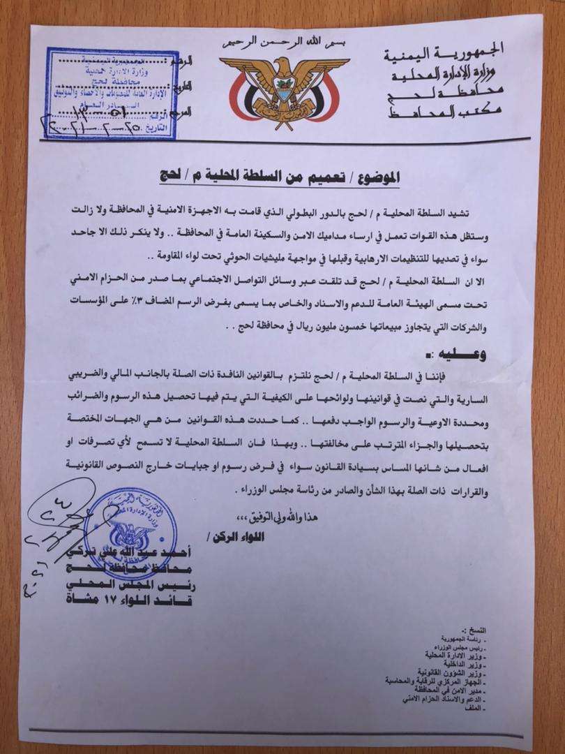 وجاء التعميم عقب اعلان قوات الدعم والاسناد فرض رسم مضاف ٣ ٪ على الشركات والموسسات في المحافظة التي يتجاوز دخلها ٥٠ مليون ريال.