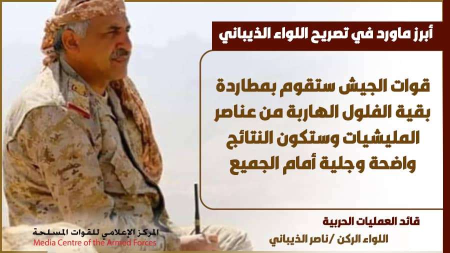 وأكد اللواء الذيباني في ختام حديثه: "سيتم القضاء على كل من تسول له نفسه أن يشم هواء محافظة مأرب، من أذناب وأدوات إيران الإرهابية".