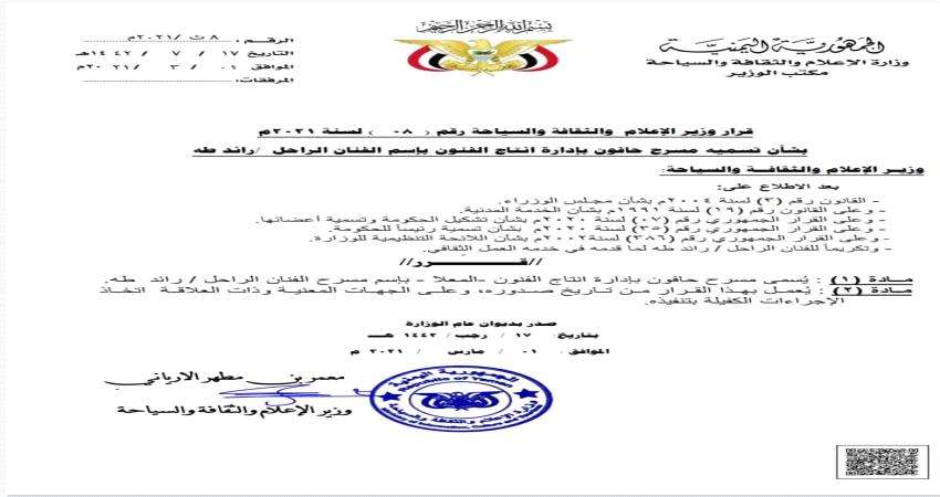 وأصدر الوزير الارياني قرار رقم 8 لسنة 2021م قضى في مادته الأولى ان يسمى مسرح حافون بإدارة إنتاج الفنون بالمعلا بأسم الفنان الراحل رائد طه فيما قضت المادة الثانية بالعمل في القرار من تاريخ صدوره 1 مارس 2021م وعلى الجهات المعنية ذات العلاقة إتخاذ الاجراءات الكفيلة بتنفيذه.