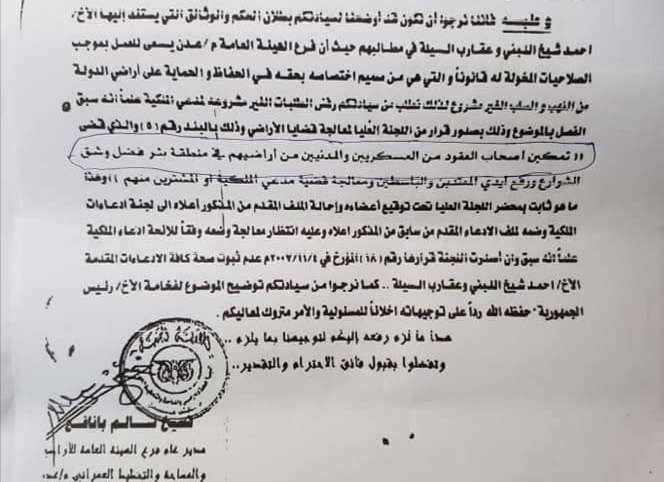الوثائق تكشف عملية التضليل ضد الهيئة العامة للأراضي والمساحة والتخطيط العمراني والذي بنيت على شراء أرض باطل من حيث سند الملكية وكذلك الموقع وكيف بعد ذلك تصدت لها الهيئة العامة للأراضي فرع عدن في فترة المدير السابق د. شيخ بانافع.