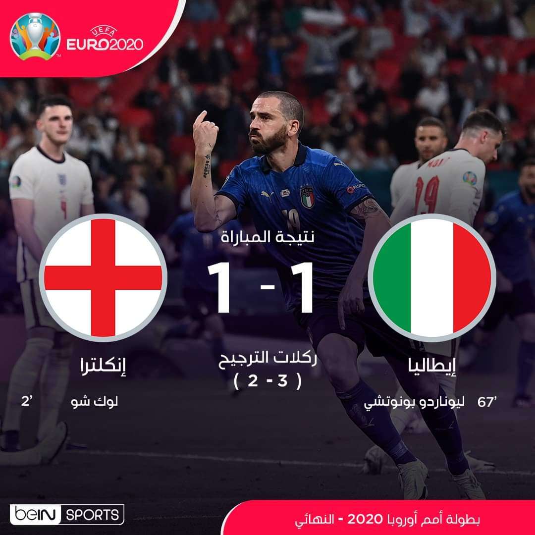 توج المنتخب الإيطالي بلقب كأس الأمم الأوروبية يورو 2020 بعد فوزه على نظيره المنتخب الإنجليزي بالركلات الترجيحية بنتيجة 3-2 في المباراة النهائية التي أقيمت على ملعب ويمبلي.