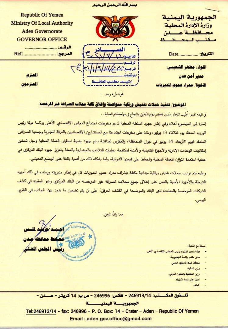 إشارة إلى الموضوع أعلاه وفي إطار جهود السلطة المحلية لدعم مخرجات اجتماع المجلس الاقتصادي الأعلى برئاسة دولة رئيس الوزراء المنعقد يوم الثلاثاء 13 يوليو، وبناءً على مخرجات اجتماعنا مع المستشارين الاقتصاديين والغرفة التجارية وجمعية الصرافين المنعقد اليوم الأربعاء 14 يوليو في ديوان المحافظة، والمكرس لمناقشة دعم جهود ضبط استقرار العملة المحلية وسبل تسخير إمكانيات الوحدات الإدارية والأجهزة التنفيذية والأمنية لمكافحة عمليات التلاعب والمضاربة بالعملة وتعزيز جهود البنك المركزي في عملية استعادة التوازن للعملة المحلية والحفاظ على قيمتها الشرائية، ولما يشكله ذلك من أهمية بالغة على الوضع المعيشي.