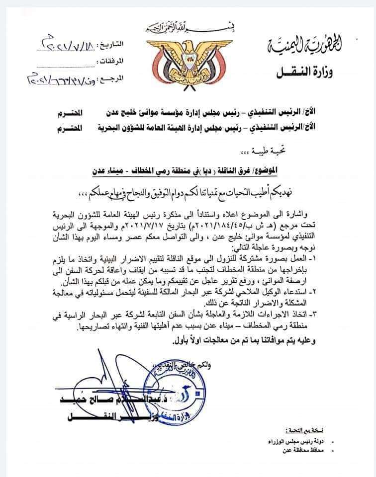 وجاء في الوثيقة الموجهه إلى الرئيسين التنفيذيين لمؤسسة موانئ خليج عدن والهيئة العامة للشؤون البحرية عدد من التوجيهات العاجلة حول غرق الناقلة ديا في منطقة رمي المخطاف بميناء عدن كالتالي: