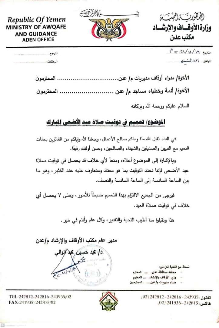 أصدر الدكتور محمد حسين الوالي مدير مكتب الأوقاف والإرشاد في العاصمة عدن تعميم في توقيت صلاة عيد الأضحى المبارك.