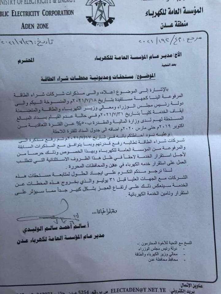 ناشد المدير العام لمؤسسة كهرباء عدن ا/سالم الوليدي فخامة الرئيس المشير عبدربه منصور هادي ، ورئيس الوزراء الدكتور معين عبدالملك ووزير الكهرباء ا/أنور كلشات ومحافظ عدن ا/ أحمد حامد لملس والمؤسسة العامة للكهرباء ، بالتدخل الفوري ومعالجة شركات الطاقة المشتراة ودفع مستحقاتهم المالية وذلك للمحافظة على استقرار التيار وتجنب خفض قدرة التوليد وزيادة ساعات انقطاع التيار الكهربائي .