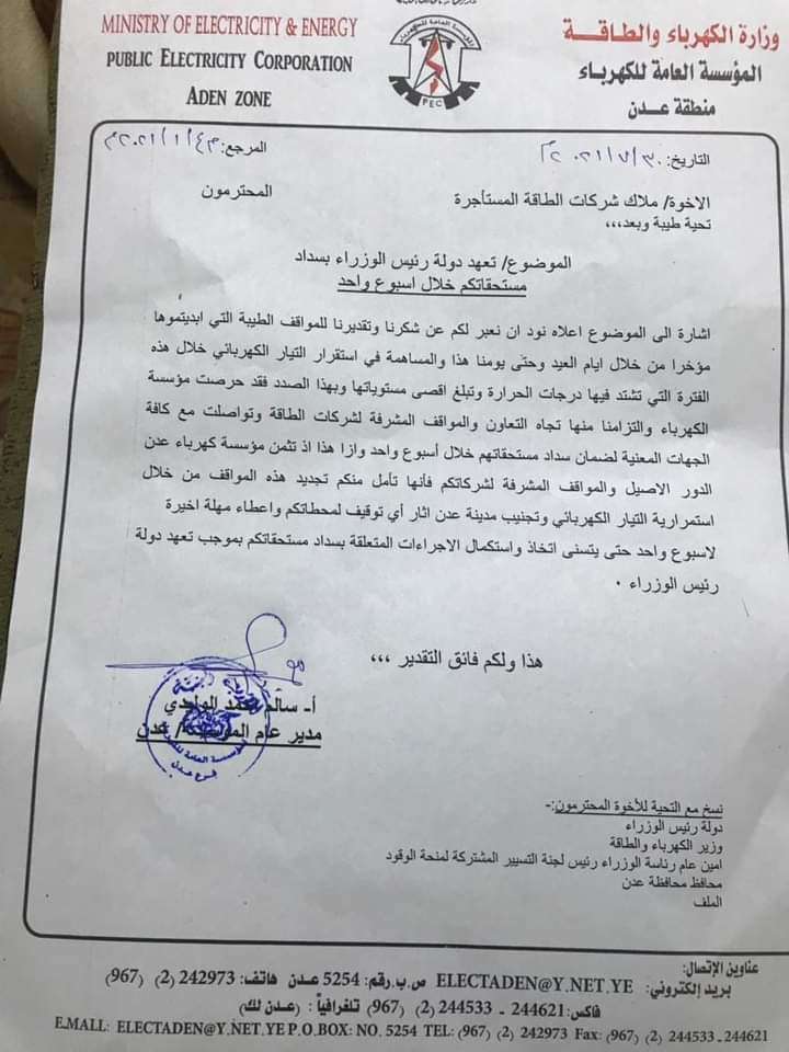 وازاء هذا اذ تثمن مؤسسة كهرباء عدن الدور الاصيل والمواقف المشرفة لشركاتكم فانها تأمل منكم تجديد هذه المواقف من خلال استمرارية التيار الكهربائي وتجنيب مدينة عدن اثار اي توقيف لمحطاتكم واعطاء مهلة اخيرة لاسبوع واحد حتى يتسنى اتخاذ واستكمال الاجراءات المتعلقة بسداد مستحقاتكم بموجب تعهد دولة رئيس الوزراء..