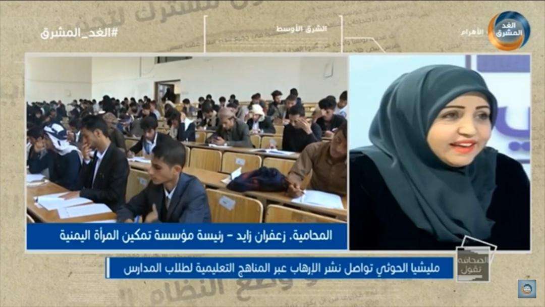 قالت المحامية زعفران زايد رئيسة مؤسسة تمكين المرأة اليمنية أثناء مداخلتها في برنامج الصحافة تقول على قناة الغد المشرق مع الإعلامي حسام باصهي إن مواصلة انتهاكات مليشيات الحوثي للمناهج الدراسية وللمجتمع واستمرارهم بهذا الشكل فأن المخرجات ألغام بشرية ، فالجماعة تكرس عقيدة الموت والكراهية للأطفال وهي الشريحة الأكثر ضررا بل هم ضحية الحشو والإرهاب الفكري ذلك على الأطفال .