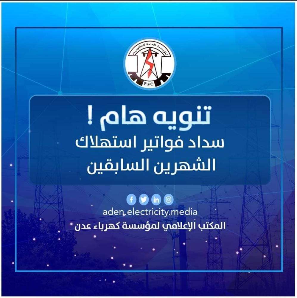وتدعو كهرباء عدن جميع المواطنين إلى الالتزام بسداد فواتير الاستهلاك الشهري بهدف تمكين المؤسسة من الايفاء بالتزامتها وإستمرارها بتقديم الخدمة بالحد الممكن.