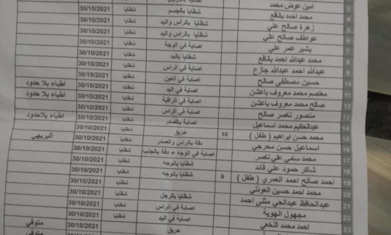 تعرف على أسماء ضحايا التفجير الإرهابي الذي استهدف البوابة الخارجية لمطار عدن بتاريخ 2021-10-30 الساعة 22:54 نشرت طوارئ أمن عدن، أسماء ضحايا التفجير الإرهابي الذي استهدف البوابة الاولى لمطار عدن، مساء اليوم السبت. وتضمن الكشف أسماء 5 شهداء و أكثر من 22 جريحا استقبلتهم مستشفيات العاصمة عدن.