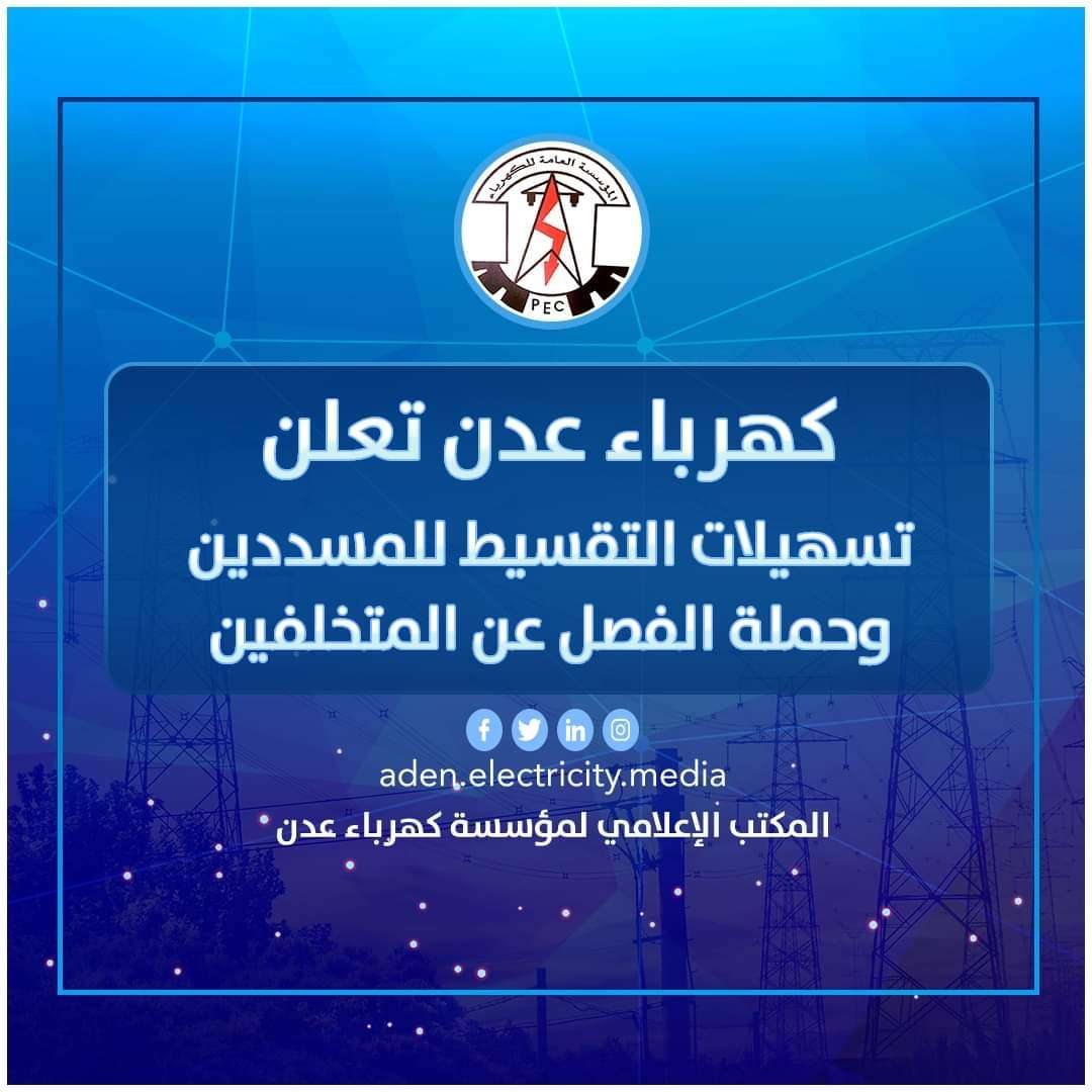 أعلنت المؤسسة العامة لكهرباء عدن عن تقديم كافة التسهيلات للمشتركين في عملية التقسيط للفواتير وذلك نتيجة للظروف المعيشية التي يعاني منها المواطنين .