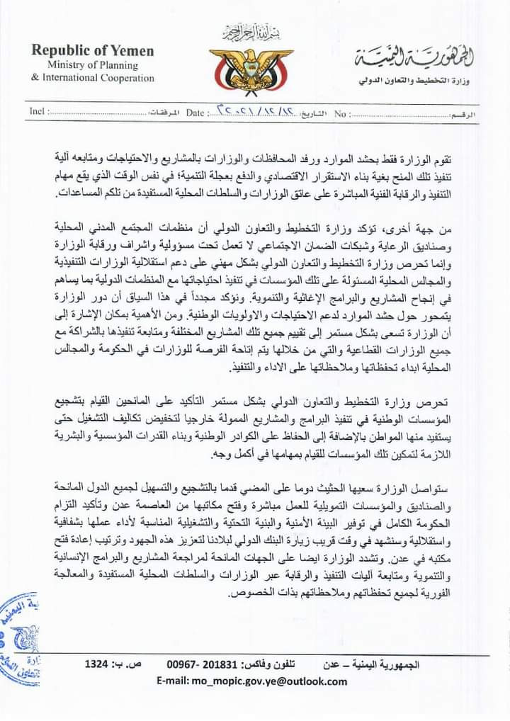 من جهة أخرى، تؤكد وزارة التخطيط والتعاون الدولي أن منظمات المجتمع المدني المحلية وصناديق الرعاية وشبكات الضمان الاجتماعي لا تعمل تحت مسؤولية واشراف ورقابة الوزارة وإنما تحرص وزارة التخطيط والتعاون الدولي بشكل مهني على دعم استقلالية الوزارات التنفيذية والمجالس المحلية المسئولة على تلك المؤسسات في تنفيذ احتياجاتها مع المنظمات الدولية بما يساهم في إنجاح المشاريع والبرامج الإغاثية والتنموية. ونؤكد مجدداً في هذا السياق أن دور الوزارة يتمحور حول حشد الموارد لدعم الاحتياجات والاولويات الوطنية. ومن الأهمية بمكان الإشارة إلى أن الوزارة تسعى بشكل مستمر إلى تقييم جميع تلك المشاريع المختلفة ومتابعة تنفيذها بالشراكة مع جميع الوزارات القطاعية والتي من خلالها يتم إتاحة الفرصة للوزارات في الحكومة والمجالس المحلية ابداء تحفظاتها وملاحظاتها على الاداء والتنفيذ.