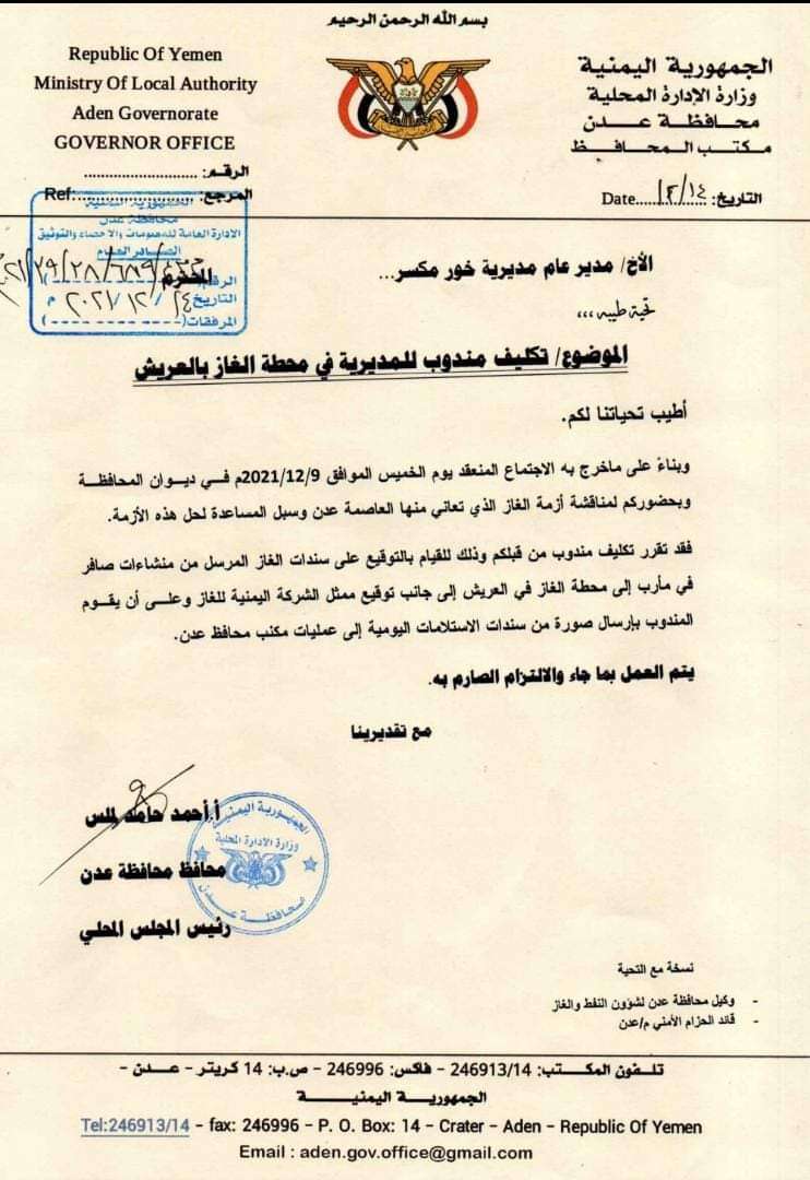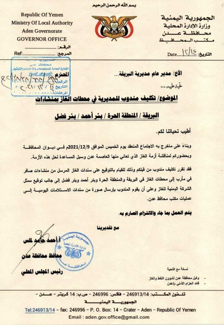 ووجه المحافظ لملس ، مدير عام البريقة ، بتكليف مندوب للمديرية في محطات الغاز بمنشاءات البريقة المنطقة الحرة بئر أحمد بئر فضل ، ومثله لمدير عام خور مكسر بتكليف مندوب لمحطة العريش ، على أن يقوم المندوبين بالتوقيع على سندات الغاز المرسل من منشاءات صافر في مارب إلى محطات الغاز في البريقة والمنطقة الحرة وبئر أحمد وبئر فضل ، والعريش في خور مكسر ، إلى جانب توقيع ممثل الشركة اليمنية للغاز وعلى أن يقوم المندوبين بإرسال صورة من سندات الاستلامات اليوميـة إلـى عمليات مكتب محافظ عدن .