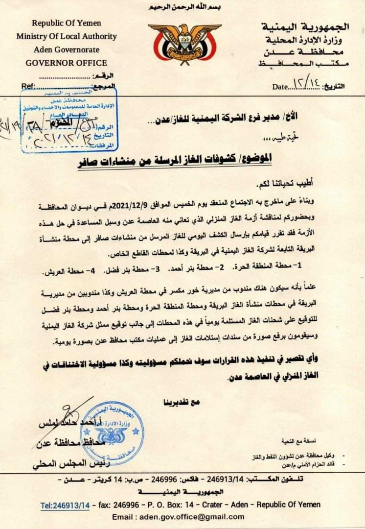 ووجه المحافظ لملس ، مدير فرع الشركة اليمنية للغاز عدن ، بأن تقوم الشركة بإرسال الكشف اليومي للغاز المرسل من منشاءات صافر إلى محطة منشـاة البريقة التابعة لشركة الغاز اليمنية في البريقة ولمحطات القطاع الخاص وهي محطة المنطقة الحرة و بئر أحمد و بئر فضل والعريش .