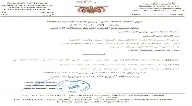 اصدر محافظ العاصمة عدن، رئيس اللجنة الامنية الاستاذ احمد حامد لملس القرار رقم "86" لسنة 2021م، بتعيين النقيب كمال مطلق الحالمي قائدا لوحدة التدخل الخاصة بمشكلات الأراضي.