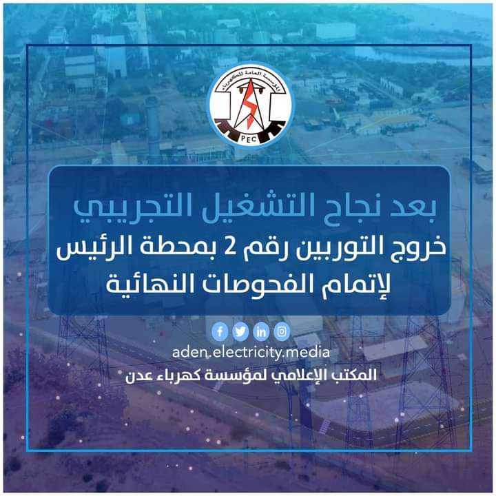 أوضحت المؤسسة العامة لكهرباء عدن أنه في الساعة الثامنة صباحاً من يومنا هذا تمت عملية خروج التوربين رقم 2 بمحطة الرئيس بترومسيلة وذلك بعد إتمام التشغيل التجريبي وإدخاله الخدمة بقدرة 110 ميجا وات بنجاح.