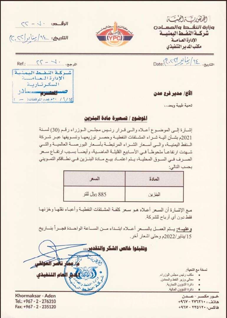 وأصدرت شركة النفط اليمنية توجيهات لفرعها بعدن باعتماد التسعيرة الجديدة